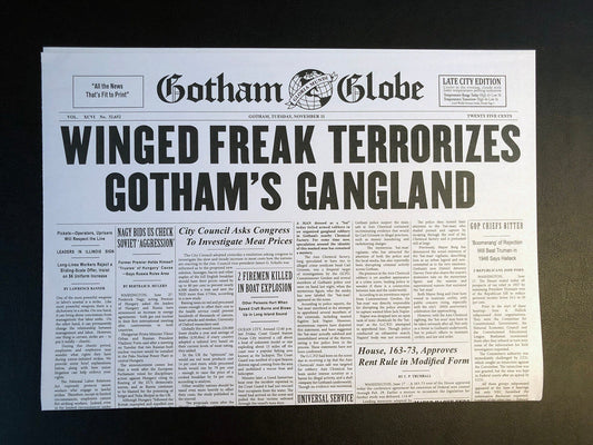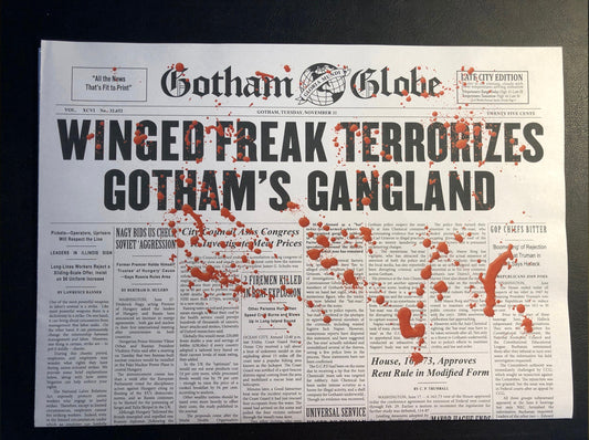 1989 Batman Winged Freak Newspaper Prop Replica - Gotham Globe - Michael Keaton