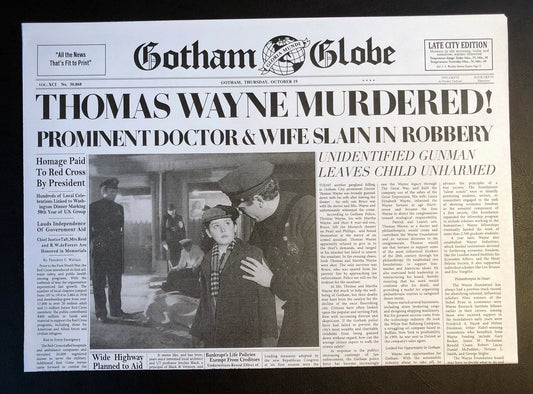 1989 Batman-Thomas Wayne Murdered Newspaper - Prop Newspaper - Gotham Globe Replica - Michael Keaton - Joker - 1989 Batman Prop